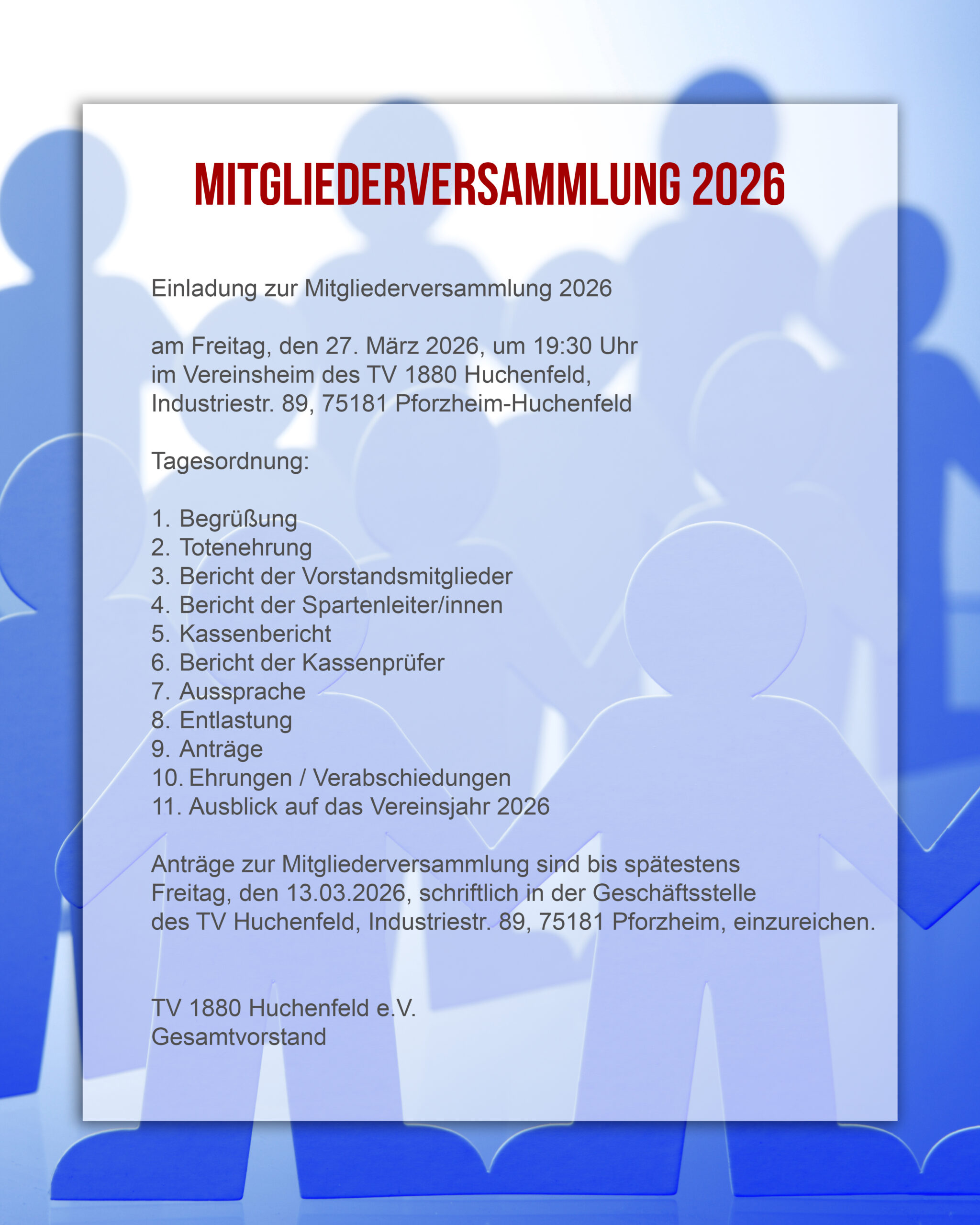 am Freitag, den 27. März 2026, um 19:30 Uhr im Vereinsheim des TV 1880 Huchenfeld, Industriestr. 89, 75181 Pforzheim-Huchenfeld Tagesordnung: Begrüßung Totenehrung Bericht der Vorstandsmitglieder Bericht der Spartenleiter/innen Kassenbericht Bericht der Kassenprüfer...