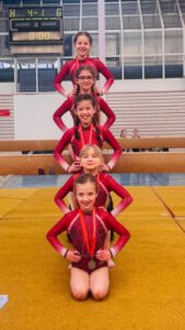 Auch in der Altersklasse 10-11 Jahre starteten für den TV Huchenfeld 2 Mannschaften. Die 1. Mannschaft mit Clara, Madita, Amelie, Faye und Meara erturnten sich hinter drei Mannschaften des leistungsstarken TB Wilferdingen den 4. Platz. Die Turnerinnen der 2. Mannschaft Lia, Philippa, Lilli und Sophia platzierten sich auf Platz 7.