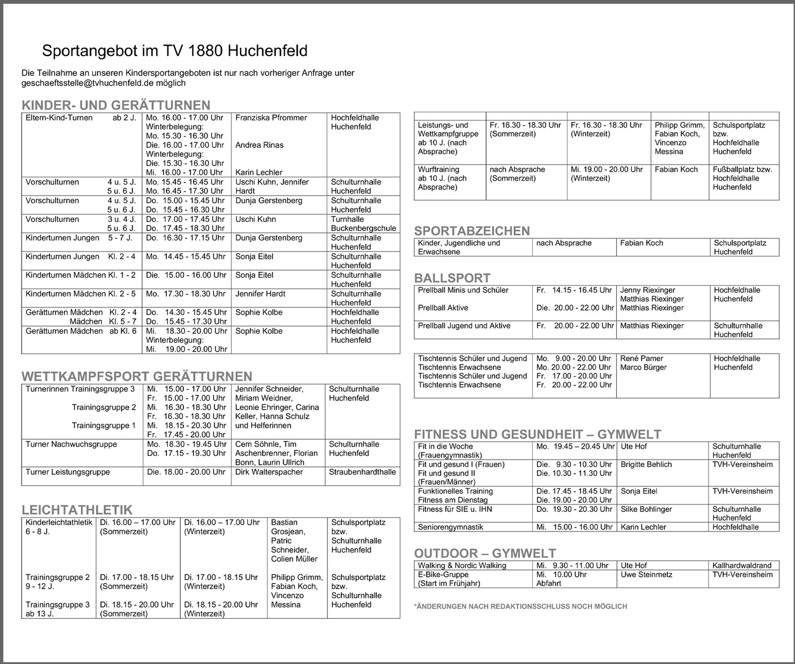Die Teilnahme an unseren Kindersportangeboten ist nur nach vorheriger Anfrage unter geschaeftsstelle@tvhuchenfeld.de möglich.