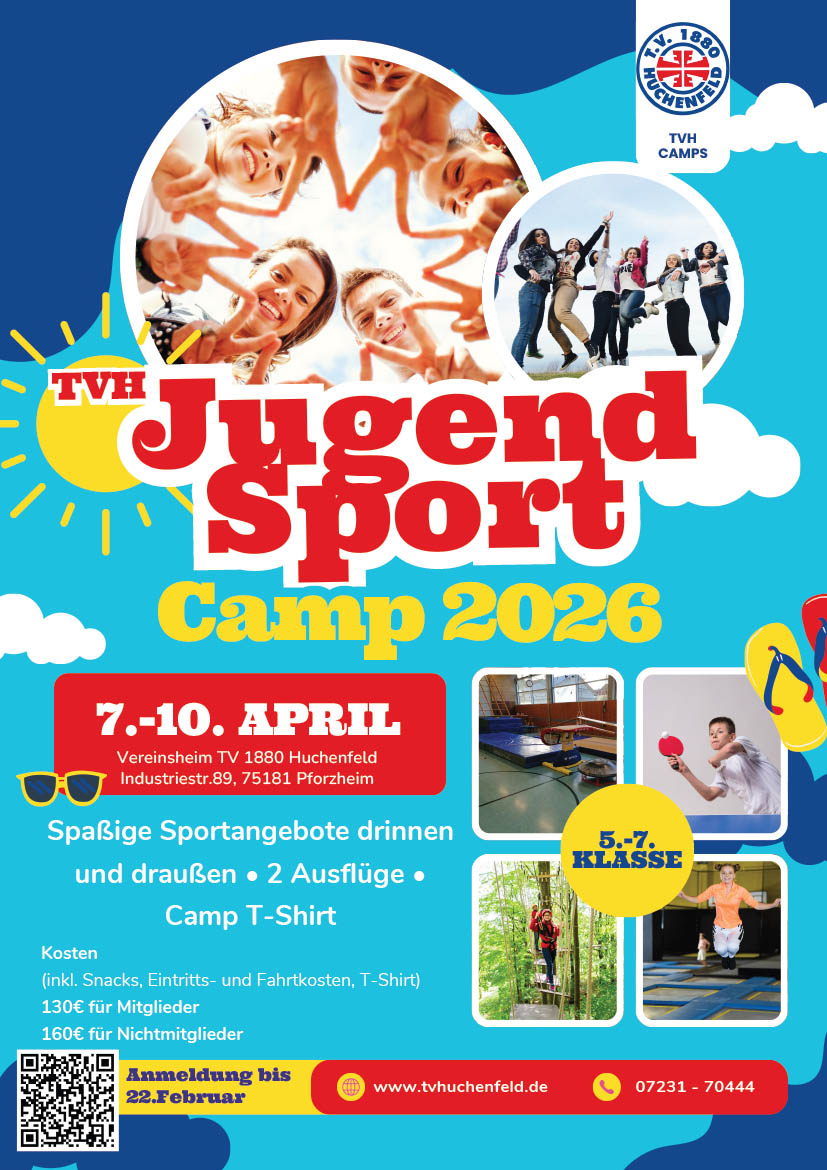 Der TV 1880 Huchenfeld bietet dieses Jahr in den Osterferien ein 4-tägiges Ferienprogramm an. Tolle Sportliche Herausforderungen und jede Menge Spaß warten in unserem TVH Jugend-Sport-Camp auf dich. Das Camp ist ein Tagescamp ohne Übernachtung für alle Jugendlichen der 5. bis 7. Klasse.